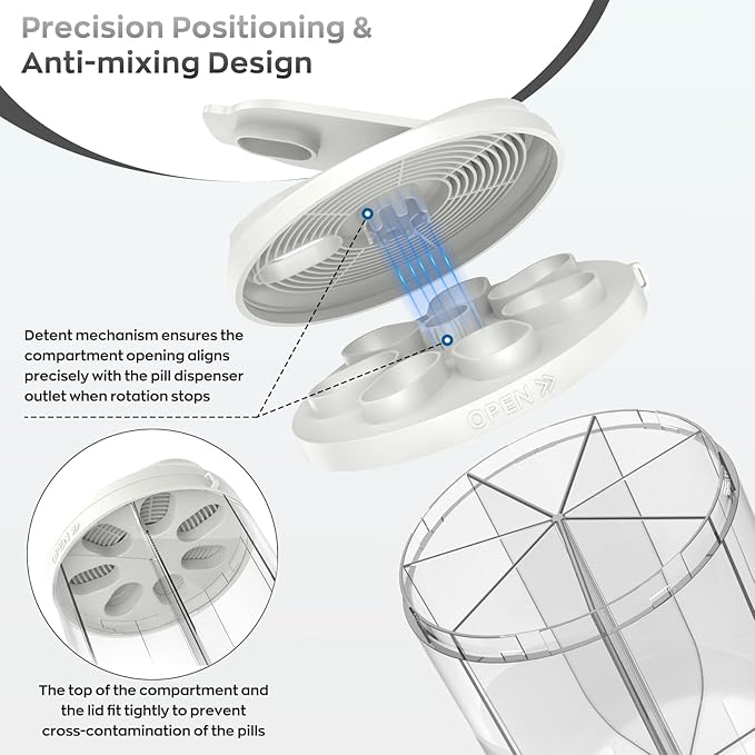 - Easy to use: Hionxmga pill storage box has a flexibly rotating lid and a wide opening, and has exclusive detent mechanism design ensures precise alignment of the compartment opening with the pill dispenser outlet after the rotation is completed. These advantages not only make the loading and taking of pills more convenient and the distribution more accurate, but also avoid the medicine from contacting external contamination. Ensure that each time you take the medicine is efficient and hygienic.
