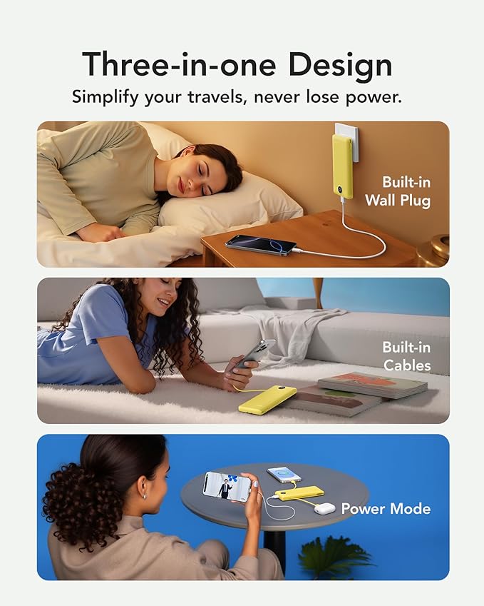 VRURC Portable Charger with Wall Plug, 10000mAh Slim Portable Charger Built in Cables,PD 20W Fast Charging Power Bank with Cords,USB C Portable Phone Charger Travel Accessories -Yellow(1 Pack)