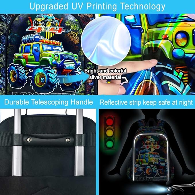 - 【Eye-catching Truck Design】- The travel rolling suitcase and backpack for boys set with cute truck patterns in front pocket, can inspire your little one to own their dreams. Best choice for your kids to go for a trip.