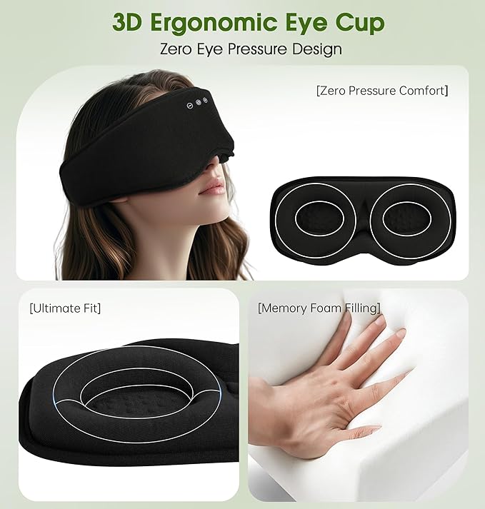 - Zero-Pressure 3D Comfort for Side Sleepers: This sleep mask with headphones is designed by sleep experts and is ergonomically designed. The 32mm deep contoured cups and ultra-soft memory foam eliminate pressure on eyes, while the 15° angled fit prevents shifting—perfect for restless sleepers. No temple or ear pressure, just all-night stability whether you’re a back, side, or stomach sleeper