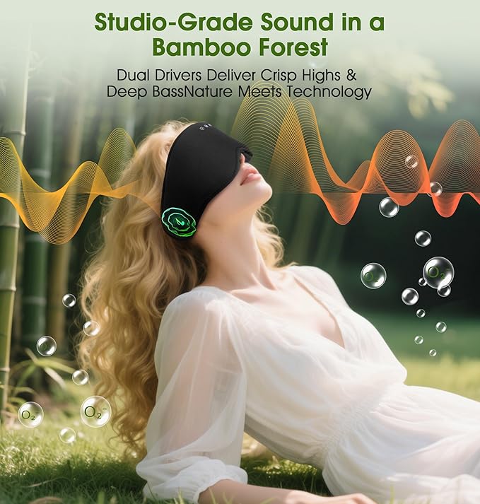 - 5.4 Bluetooth & Premium Audio: More than just a sleep mask, it’s a high-res sound system. With 96kHz audio and ultra-fast 900Kbps transmission, stream music, podcasts, or white noise seamlessly. Built-in microphones allow for crystal-clear calls, while the thin, flexible speakers stay comfortable all night. HIFI stereo sound quality makes you feel like you are in a concert. Relax your mind by enjoying the beautiful sounds of nature in the refreshing bamboo forest with our sleep mask