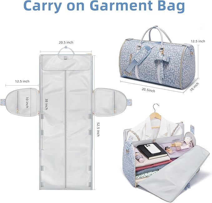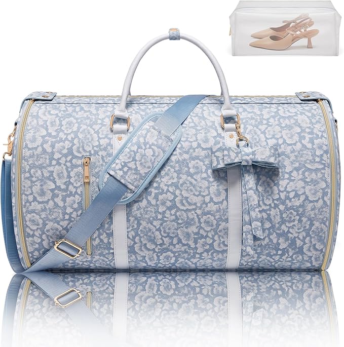 Travel Garment Bag for Women, Foldable Carry On Garment Duffle Bag 20.5x10x12.5 Inch, Convertible Overnight Bags with Shoe & Toiletry Pockets for Business Trip, Vacation, Party, Blue-White