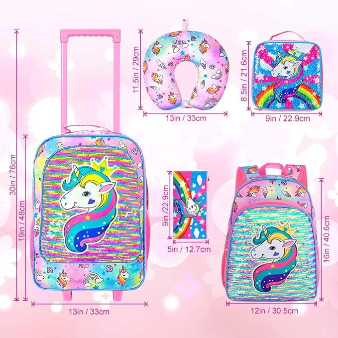 - Eye-Catching Design: This 5PCS girls suitcase set features dazzling reversible sequins, with a dreamy and delightful unicorn design that glows magically. The high-quality, eco-friendly, water-resistant fabric makes the kids luggage set for girls perform better.
