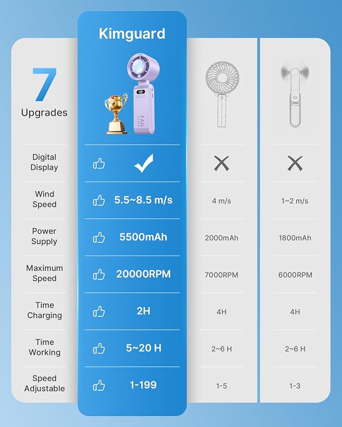 - Ultra-Fast Turbo Cooling: Features an advanced 7-blade design paired with a high-speed three-phase brushless motor, delivering a maximum wind speed of 8.5m/s β 2x faster than traditional hand held fans! With a 20000 rpm maximum speed, it instantly blows away the heat, keeping you cool and comfortable all day long