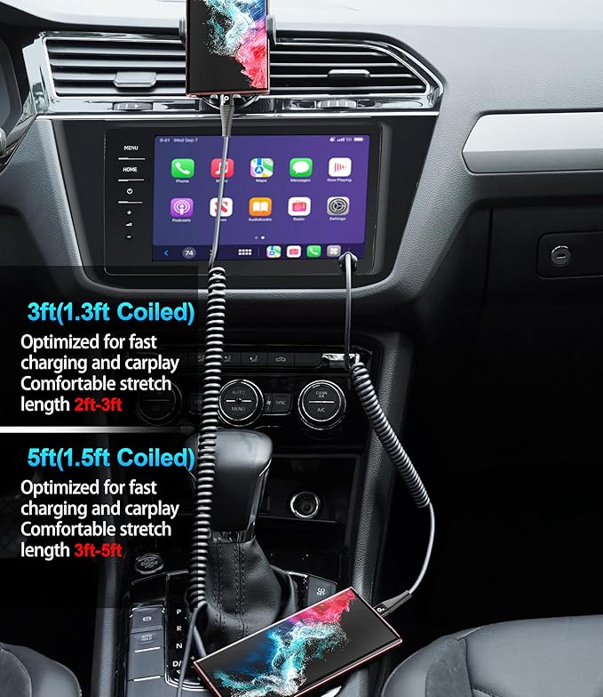 - Coiled USB C Cable Fast Charging for Car 6FT-Black
