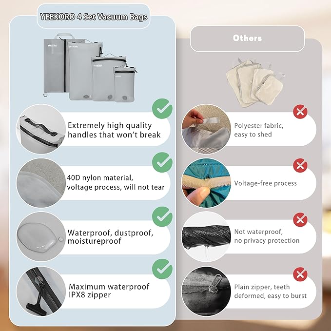 - 【Reminder】1. The 4 set vacuum bags for travel are only suitable for spring and summer light jackets, T-shirts, etc.2. Due to the different thickness of clothing, the number of clothes labeled in the picture is for reference only, the actual loading capacity will be different.3. Please check the size before purchase, please choose YEEKORO store large vacuum bag if you need to store thick jackets, etc.