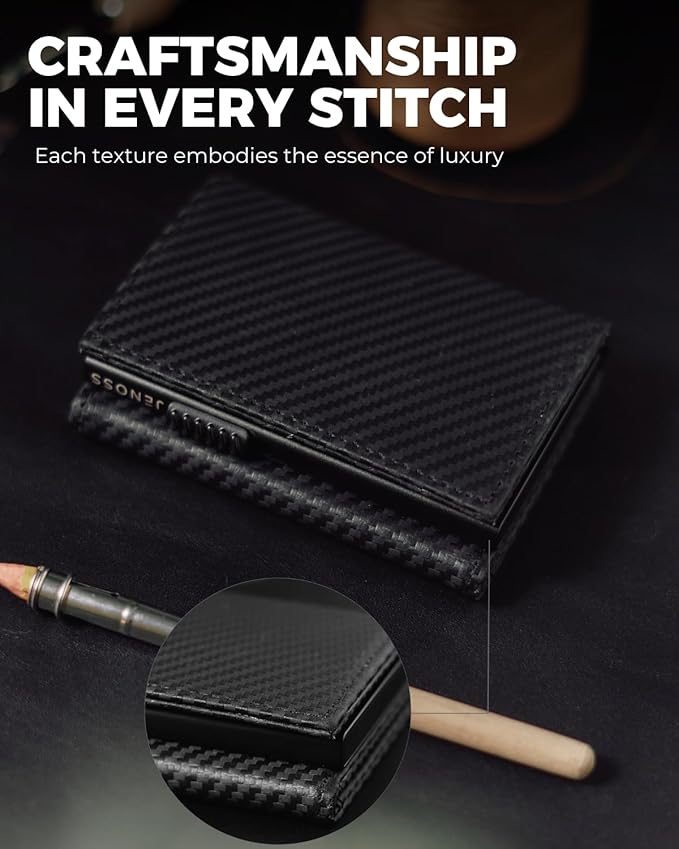Jenoss Smart Wallet For Men: Full Grain Leather, Handcrafted, Slide Metal Pop Up Case, Slim RFID Blocking Credit Card Holder, Minimalist, Compact - 9-12 Card Organizers | ID | Money Clip (Carbon)