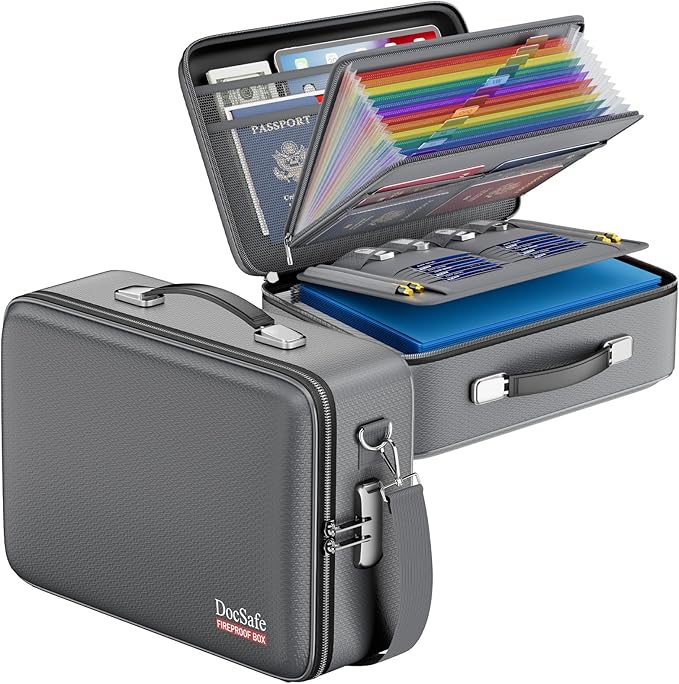 DocSafe Fireproof Document Box with Lock, Hard Case File Organizer with Accordion File Folder, Fireproof Water Resistant Safe Box Home Office Travel Storage for Important Documents Laptop Gray