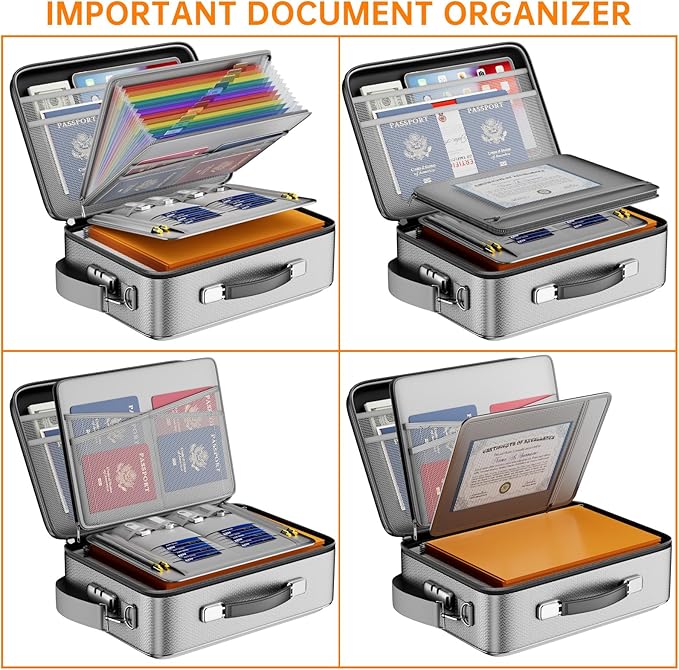 - Fireproof Box with Lock: Protect your valuables with the built-in high-quality combination lock (No keys required). Design with a strong handle&a detachable shoulder strap for carrying everything you needed easily. The fireproof box is suitable for business, travel, office, school, home storage, of course, giving it as a gift to your family is also a good choice. Fireproof box is both fireproof and water-resistant, ensuring your documents stay protected during fires, floods, or wet weather