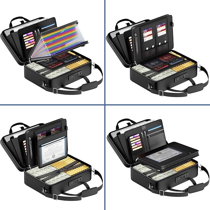 - [All-Round Secure & Portable Protection File Box]This hard-shell organizer combines fireproof, water-resistant, and dust-proof protection to safeguard documents from fire, flooding, and humidity. Featuring metal zippers, and reinforced seams, it ensures secure storage. The detachable shoulder strap and sturdy handle make it easy to carry and suitable for travel, home and emergency use, combining strong security and daily convenience.