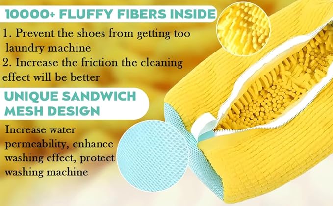 - 【360° Mesh Shoe Washing Bags】: Safely clean your sneakers, athletic shoes, and casual footwear with our reusable shoe washing bags. Designed for both washers and dryers, these bags feature a 360° mesh design that allows thorough cleaning while protecting your shoes from damage. The self-locking zipper ensures a secure wash, and the soft chenille fibres inside prevent scratches. Perfect for canvas, mesh, and synthetic materials, these bags make shoe cleaning effortless and effective.