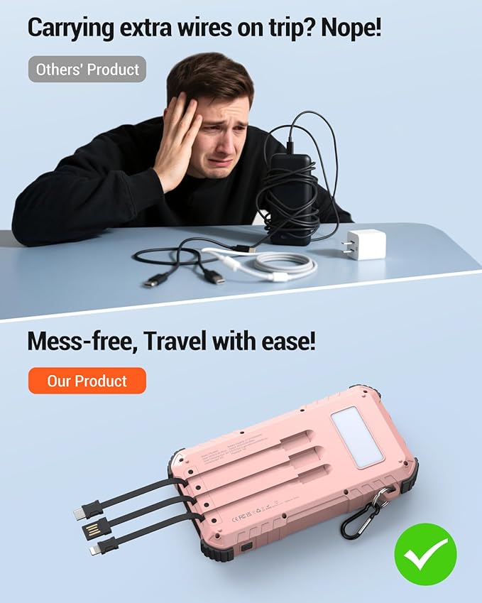 - Built-in Fast Charge Cables for All Devices: The portable power bank has 3 built-in cables and 3 ports for output, especially the Type-C charging port is both for in and output, the output charging speed is faster than most of the battery packs on market. It can charge up to 5 devices simultaneously, great helper for camping, hiking, travel and outdoor activities.