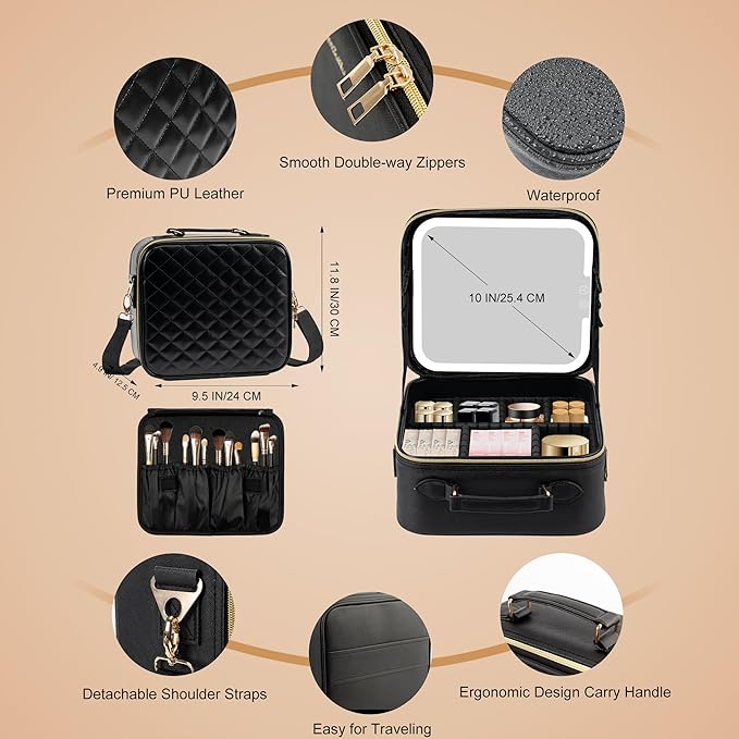 SJD Travel Makeup Bag with LED Mirror, Portable Cosmetic Case Organizer with Lighted Mirror, Waterproof Makeup Case for Cosmetic Brush Holder Storage, Black Toiletry Bag for Women Gift