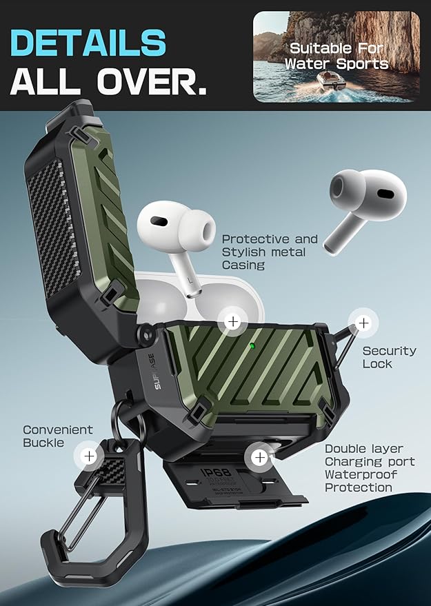 SUPCASE for AirPods Pro 3 Case with Lock & Carabiner, [IP68 Waterproof] [Military-Grade Protection] [Supports Wireless Charging] Anti-Scratch Hard Shell Cover for AirPods Pro 3rd Gen, Guldan
