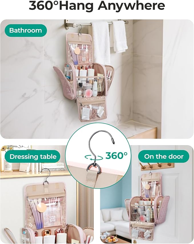 - 【Convenient Design】: The inner pockets are equipped with elastic straps to securely hold bottles upright, and the transparent zipper pockets allow for easy visibility and access to items without the need to open them. The customized metal zipper closure ensures a smooth and effortless pull, while the 360-degree rotatable and foldable anti-slip metal hook offers versatile hanging options. Additionally, the top handle allows for convenient carrying.