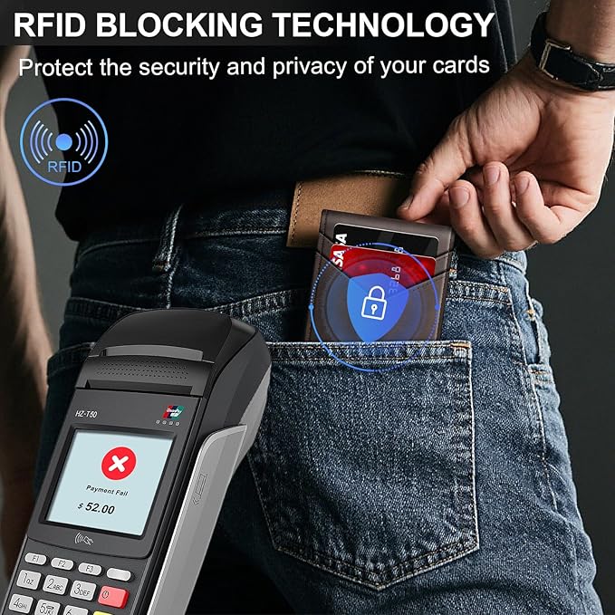 - RFID BLOCKING: The rfid wallet for men is lined with RFID-blocking fabric inside the leather layers. This protects your personal and financial information from unauthorized scans.