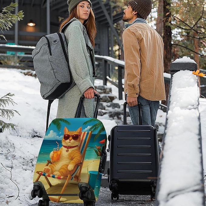 - Fun & Cool Cat Design: This fun summer luggage cover features a cool cat in sunglasses, relaxing on the beach with a drink in hand