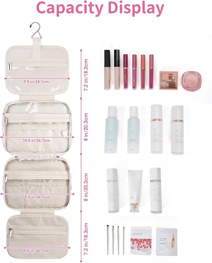 - NOT BULKY DESIGN - Large Capacity yet compact design, weighing 14 ounces. large metal hook allows hanging the toiletry case from towel rack, coat hook or whereever is available, making your toiletries and cosmetics displayed well for easy access