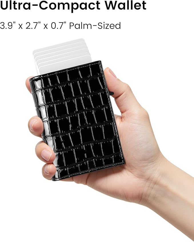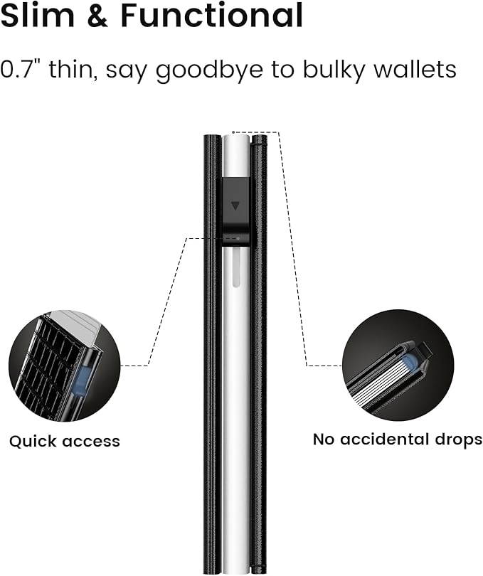 - Quick Access: Equipped with a smart pop-up design – press the side button, and 7 cards fan out in a stepped pattern for easy access. After use, push the cards back – they lock securely in the card holder and stay organized