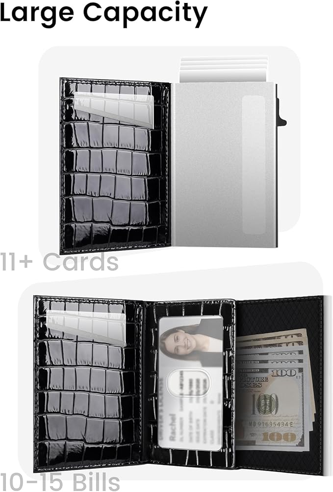 - Small But Large Capacity: Trifold wallet features a thin, timeless design with a compact size ( 3.9''x2.7''x0.7'' ) that fits effortlessly into any bag. It holds up to 11+ cards and 10-15 bills, and includes 1 clear ID window