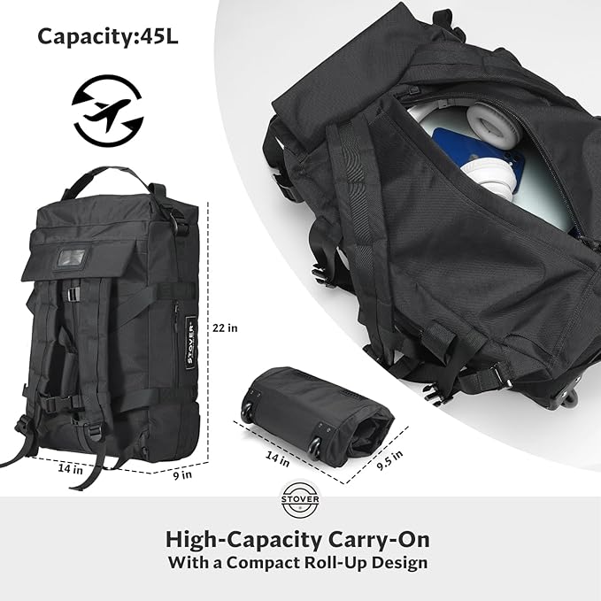 STOVER 45L Carry-On Rolling Duffel Bag with Wheels, Medium Durable Travel Duffle w/Toiletry Bag, Heavy-Duty, Packable, Foldable with Shoulder Straps- Use as Luggage or Backpack, Men/Women (Black)