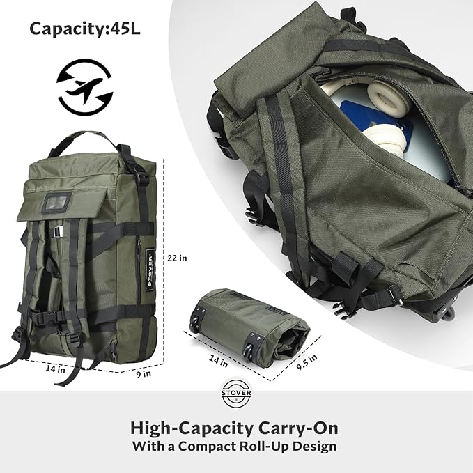 STOVER 45L Carry-On Rolling Duffel Bag with Wheels, Medium Durable Travel Duffle w/Toiletry Bag, Heavy-Duty, Packable, Foldable with Shoulder Straps- Use as Luggage or Backpack, Men/Women (Green)