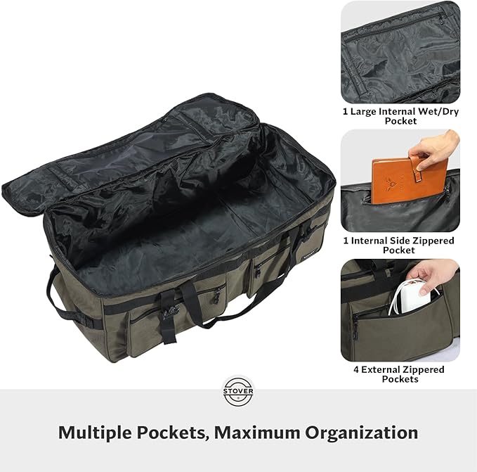 STOVER 100L U-Zip Rolling Duffel Bag with Wheels, X-Large Durable Travel Duffle + Toiletry Bag, Heavy Duty, Lay-Flat Opening, Packable w/Shoulder Straps- Use as Luggage or Backpack, Men/Women (Green)