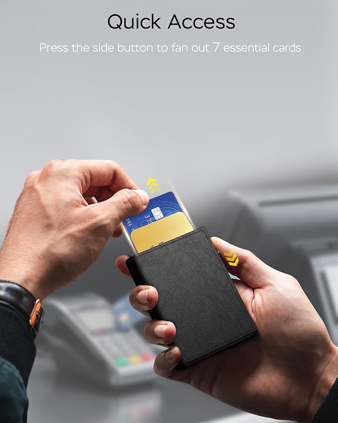 - Quick Access: Equipped with a smart pop-up design - press the side button, and 7 cards fan out in a stepped pattern for easy access on any occasions. After use, push the cards back โ they lock securely and stay organized
