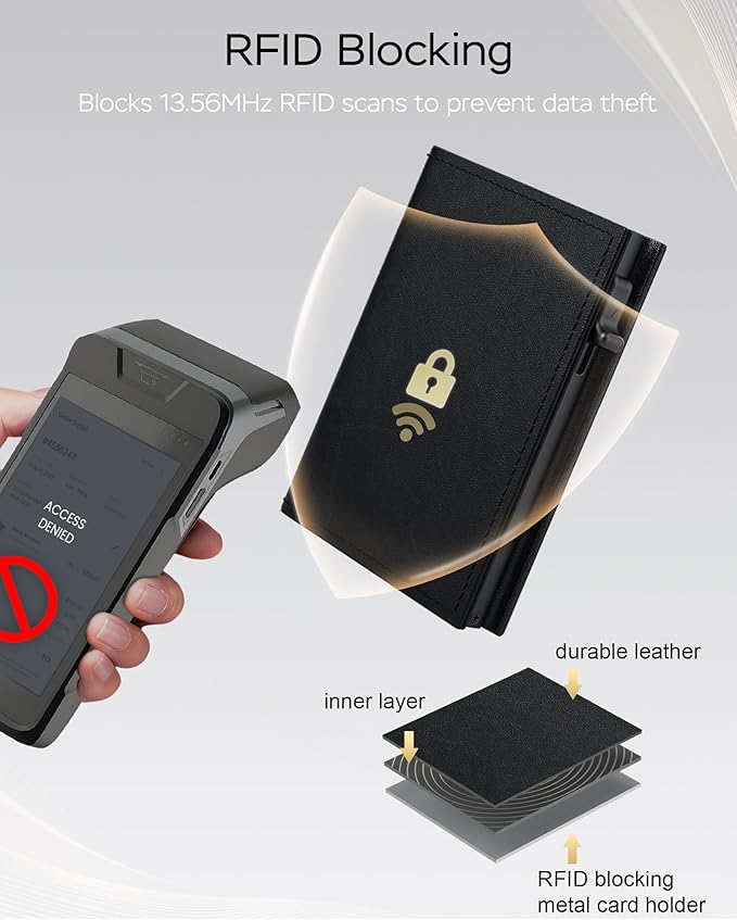 - RFID Blocking Tech: Creates a secure barrier around your cards, stopping thieves from wirelessly scanning your credit card info. In crowds, cafes or during travel, it shields data from skimmers