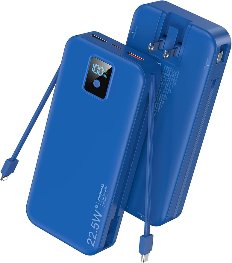 Portable Charger, 20000mAh 22.5W Fast Charging Power Bank with Built-in Cables & Wall Plug, Travel Essentials Battery Pack with LED Display, USB C External Battery Bank for iPhone iPad, Samsung Navy