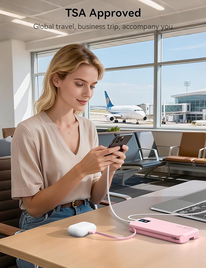 Portable Charger, 12000mAh 22.5W Fast Charging Power Bank with Built-in Cables & Wall Plug, Travel Essentials Battery Pack with LED Display, USB C External Battery Bank for iPhone iPad, Samsung Pink