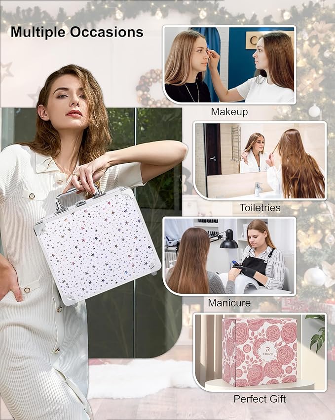 - Professional Makeup Case with LED Mirror: The size of the travel makeup case is 9.8 x 8.6 x 5 inches, featuring durable ABS aluminum construction with metal-reinforced corners. Integrated LED mirror with adjustable lighting ensures optimal makeup application conditions. Essential for both professional makeup artists and beauty enthusiasts.