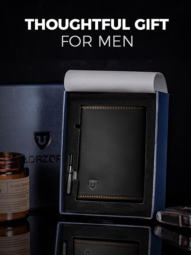 LORZOR Minimalist Wallet for Men with Credit Card Holder, Finest Full Grain Leather, Pop up Smart Wallet, Trifold Slim Wallet, RFID Blocking, Front Pocket, ID Window (Black/Yellow Black)