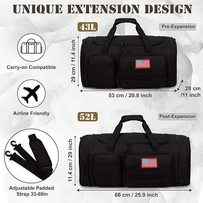 Tactical Duffle Bag For Travel Expandable 52L Large Duffle Bag For Men Gym Duffel With Wet Pocket Multi-Functional Carry On Bags Weekender Overnight Bag Organizer Duffel Bag For Travel