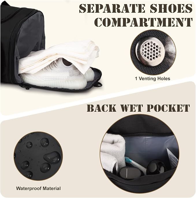 - Military Grade Water Resistant Fabric Tactical duffle bag constructed from 900D water-resistant material with 2 smooth zippers, resisting wear and tears. Padded handles and 33-60in adjustable shoulder strap (with sturdy hooks) ease carrying strain. Independent shoes compartment features air vents to prevent odor, while the back PVC-lined wet bag isolates damp items. duffle bag for men, its rugged materials and thoughtful details tackle any environment.