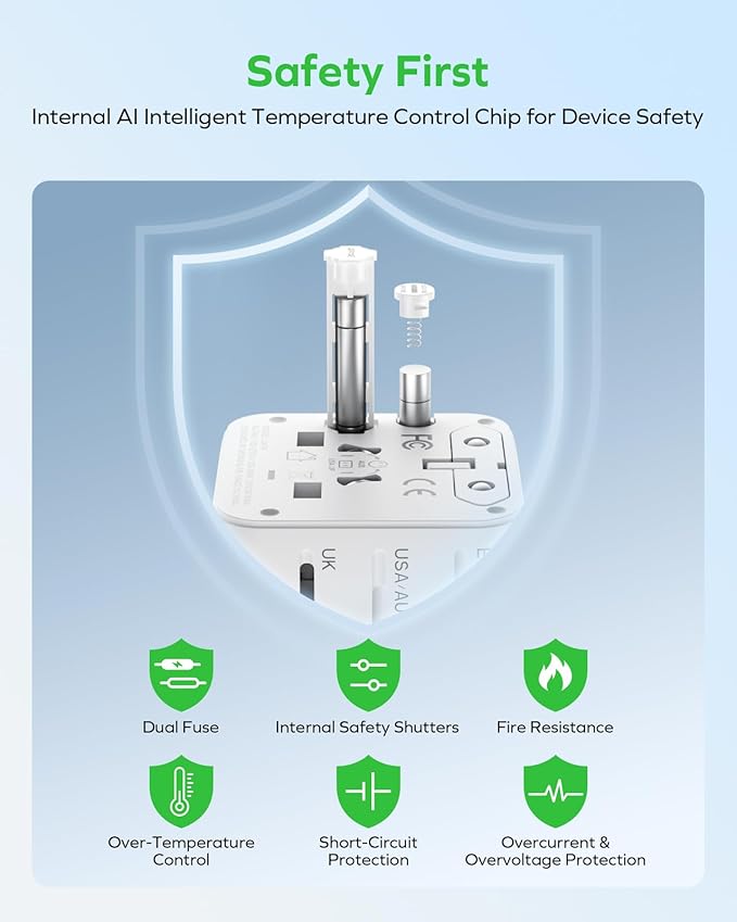 - SAFETY FIRST - This compact travel plug adapter does not have surge protection and can be conveniently used on a cruise ship as well. Built-in dual 10A replacement fuse, safety shutters, separate plug lock system, RoHS, CE, FCC certifications. [For your intimate use, we have carefully designed more safety and usage upgrades, which are described in the detail pages!]