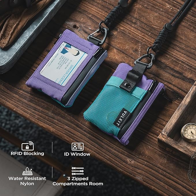 VULKIT Small RFID Wallet for Women & Men – Minimalist Zipper Wallet with ID Window, Keychain & Carabiner, Holds 15 Cards, Water Resistant Travel Lanyard Wallet AauaGreen Purple