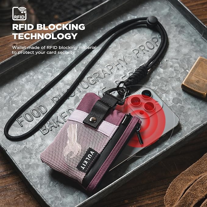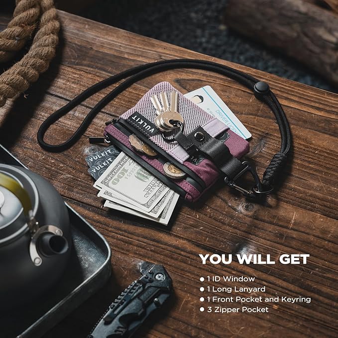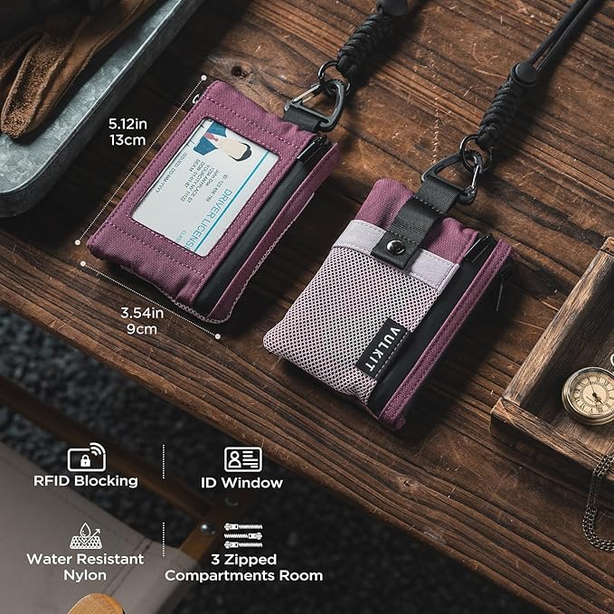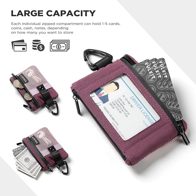 VULKIT Small RFID Wallet for Women & Men – Minimalist Zipper Wallet with ID Window, Keychain & Carabiner, Holds 15 Cards, Water Resistant Travel Lanyard Wallet Wine Pink