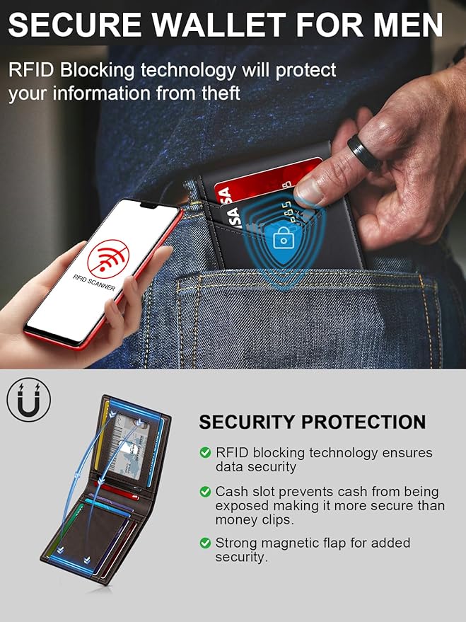 - TRANSPARENT ID WINDOW: The leather wallets for men includes a transparent ID slot on the inside, perfect for storing your ID, work badge, driver’s license, access card, or transit pass.