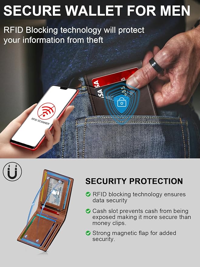 - TRANSPARENT ID WINDOW: The leather wallets for men includes a transparent ID slot on the inside, perfect for storing your ID, work badge, driver’s license, access card, or transit pass.