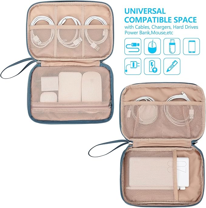 NISHEL Travel Cord Organizer Case, Double Layers Tech Electronic Bag, Essentials for Charger, Cable, Phone, Flash drive, Large, Lake-Blue