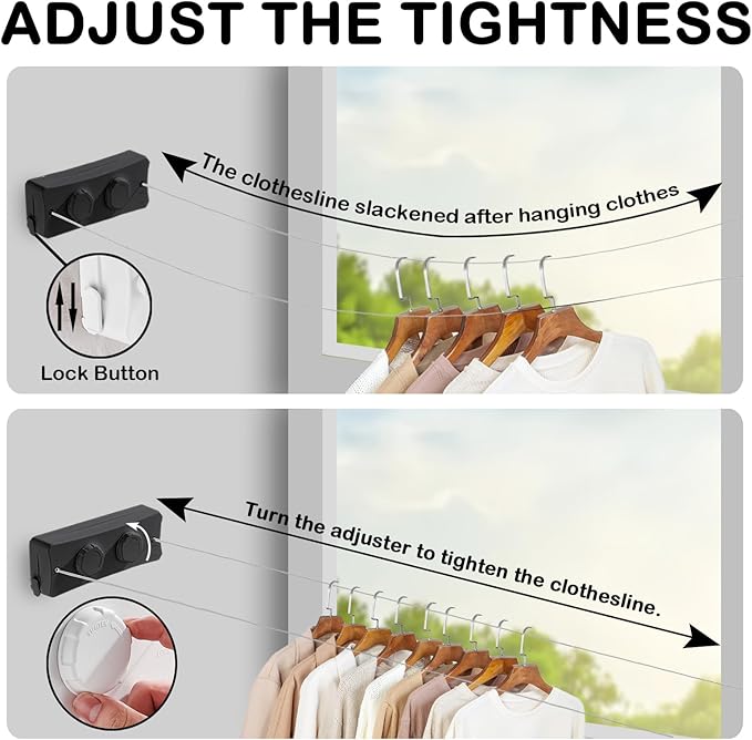 - 【Space-Saving Retractable Design】Convenient built-in tightener retracts the line smoothly and safely when not in use. Durable ABS housing protects the mechanism, keeping your space neat and tidy.