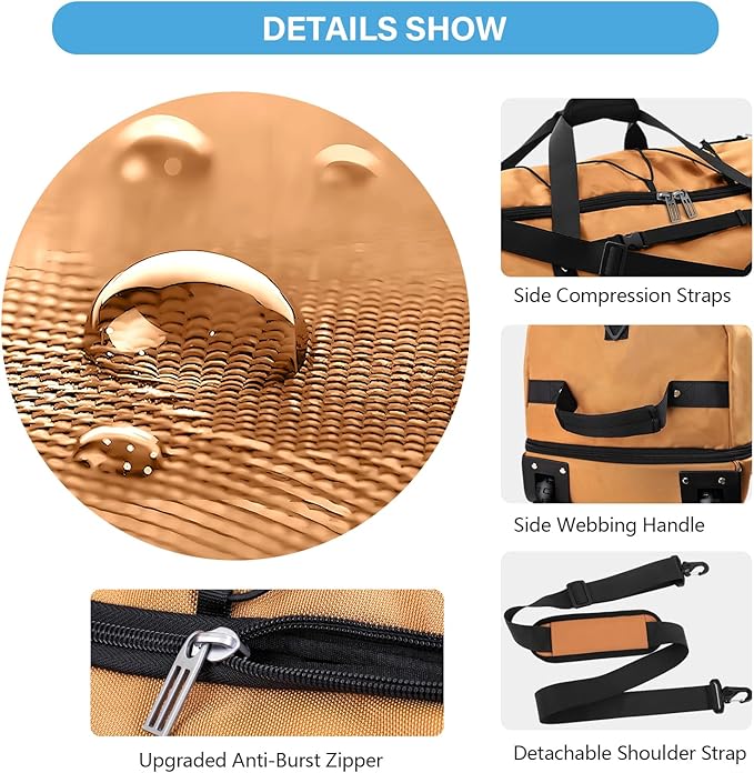 - 600D PVC-laminated oxford + seam-sealed construction + dual-slider anti-burst zipper (passed sudden force pull test). Resists downpour & baggage handling.