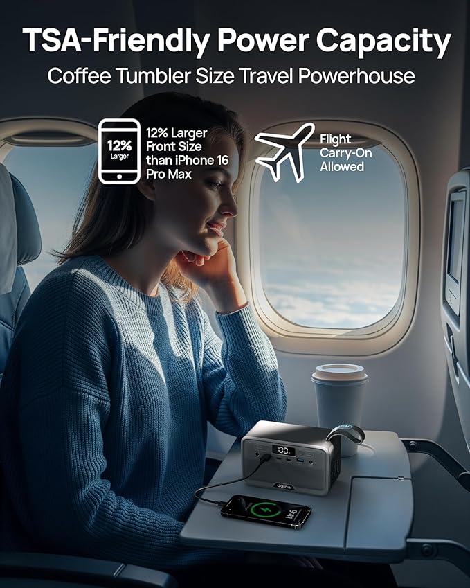 - [𝐕𝐞𝐧𝐭𝐢-𝐂𝐮𝐩 𝐒𝐢𝐳𝐞𝐝 𝐓𝐒𝐀 𝐀𝐩𝐩𝐫𝐨𝐯𝐞𝐝 𝐏𝐨𝐰𝐞𝐫𝐡𝐨𝐮𝐬𝐞]: Get through TSA flight check quickly without worrying about flight delays with this compact venti coffee cup sized power station (6.5x3.3x4.0 in). Only weighs 2.5 lbs, roughly about 1.5 bottles of soda, and fits perfectly into your carry-on luggage. Make your trip go lighter.