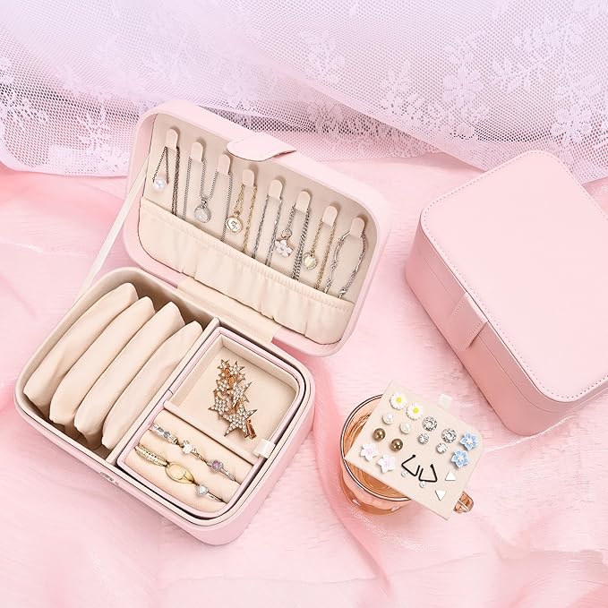2 Layer Portable Jewelry Box, Large Jewelry Travel Case with 4 Jewelry Pouches, Medium Size Jewelry Organizer Box for Earrings, Necklaces, Bracelets (light pink)