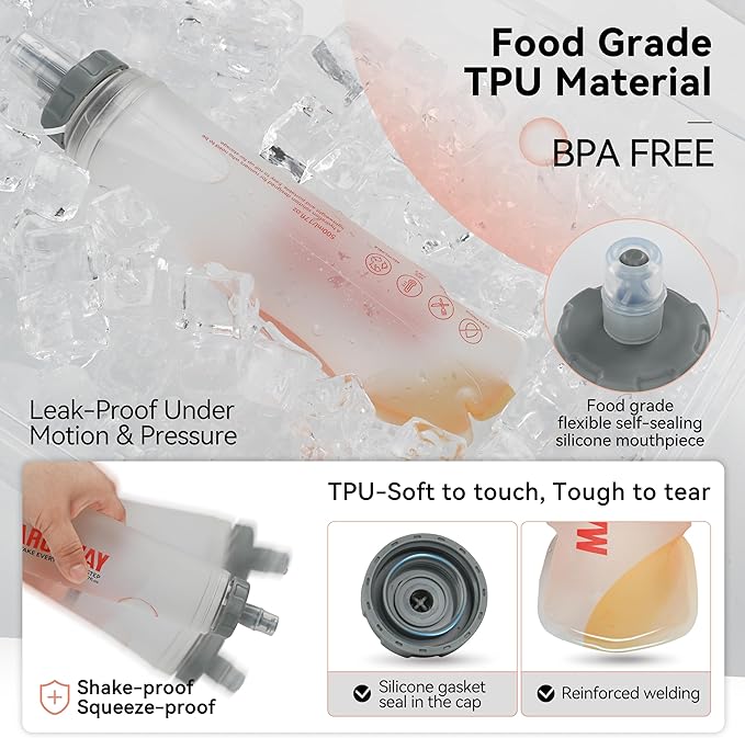- Durable & Reliable: TPU delivers exceptional flexibility and resilience, resisting drops, wear, and repeated folding. It stays tough even in extreme cold, ensuring reliability in harsh conditions. Tasteless and BPA-free, it keeps water fresh. Silicone-gasketed threaded cap and self-sealing bite valve prevent leaks during intense movement.