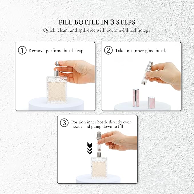 - Easy to Refill in Seconds – Innovative bottom-fill system transfers perfume directly from your full-size bottle with no funnels or mess. Just pump, fill, and go — ready for your next trip.