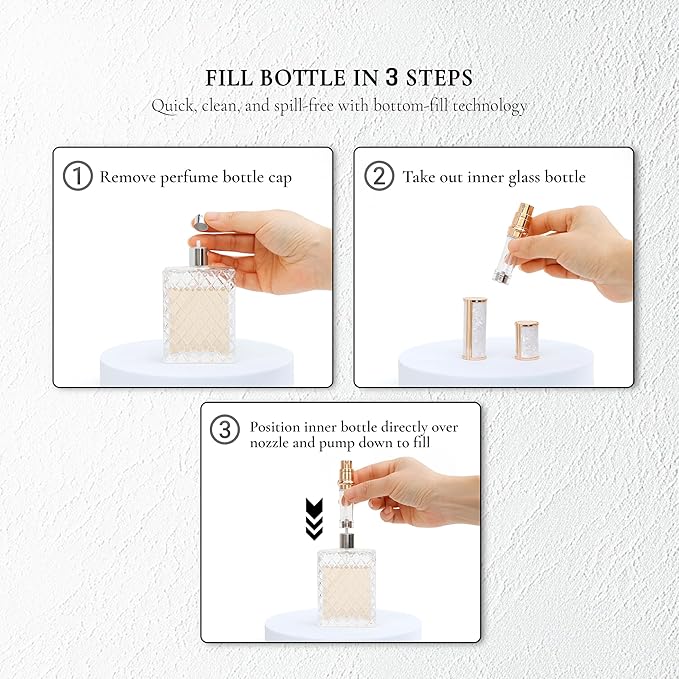 - Easy to Refill in Seconds – Innovative bottom-fill system transfers perfume directly from your full-size bottle with no funnels or mess. Just pump, fill, and go — ready for your next trip.