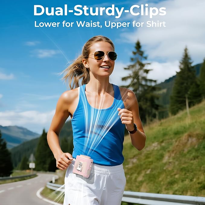 - Versatile Belt Fan: Use it as a waist cooling fan when clip it on belt, shirt, or pants, or as a neck fan to free your hands with a landyard, bracket design lets it stand as a desk table fan; It also features an ultra bright LED light and SOS flashlight, making it useful for nighttime walks and outdoor adventures
