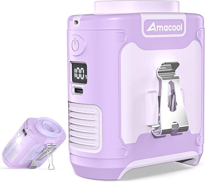- Rechargeable & Portable: Wearable small fan get power supply from USB devices via 5V-2A input port within 4-5 hours, and support working while charging, ensuring continuous comfort wherever you go. Only 0.63lb, so you can take it anywhere, perfect for camping,travel,fishing,Disney,hiking,cycling; Package includes AMACOOL belt fan, USB-C cable, adjustable landyard